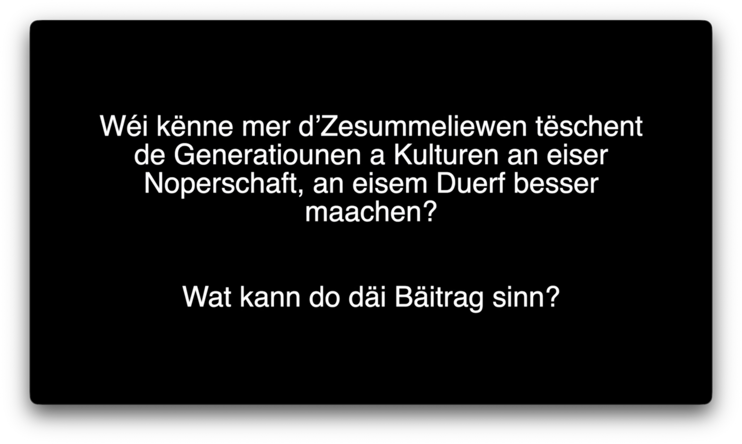 Mënschen am Duerf zesummebréngen – duerch Austausch, kleng Gesten an echten Zesummenhalt am Alldag. An enger Zäit, an där d’Liewen oft anonym an individuell ass, solle Gemeinschaft a Mënschlechkeet nees eng Plaz kréien.